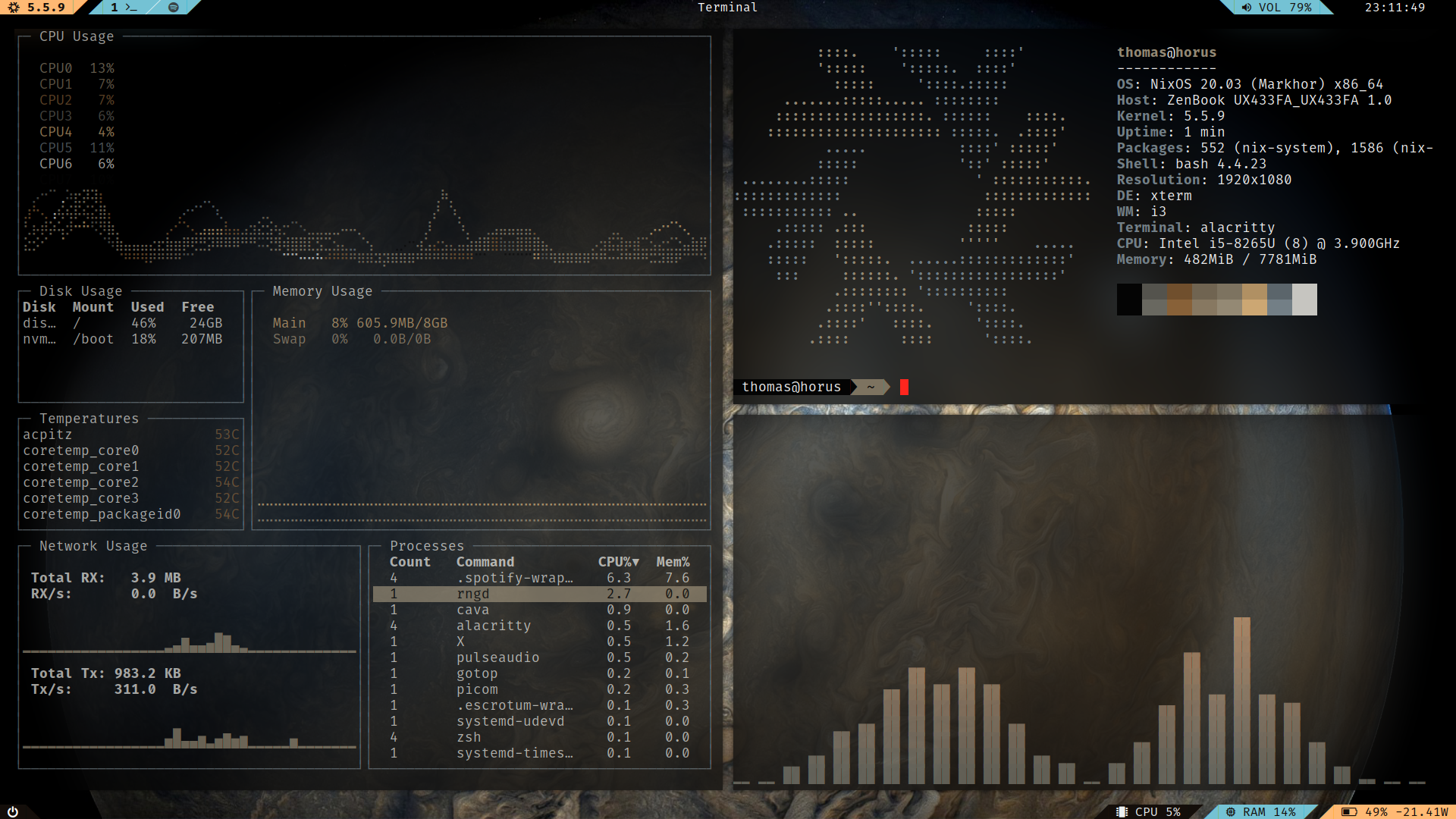 This is the home-manager configuration I'm using on my laptop which runs Nixos 20.03. I'm only using 20.03 nixos and home-manager channels, so you don't need unstable in order to use these files.