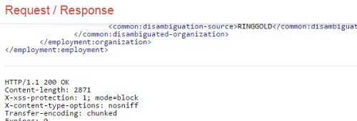 - The XML for the ORCID record that you requested will appear in the Request/Response section on the right side of the screen.