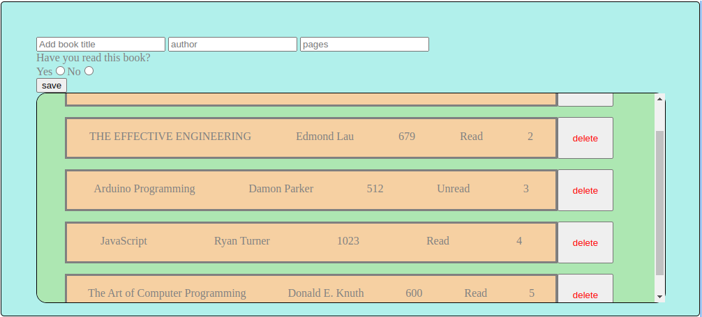 This app has to parts: The first part is where you add a book title, author, pages and whether it is read or not. The second part is where all added books display. You can scroll down to see all books and you can delete any book that you want to remove from the list.