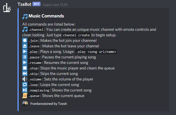 If you want to look at music commands of TzeBot, just type ".help music":
