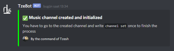 If you aim to use TzeBot as a music bot that you might have been noticed ".channel" command. You can use TzeBot as a normal music bot by writing each command ".play", ".skip", ".volume"... Or you can just setup your music channel to feel the difference and convenience of TzeBot. Type ".channel create":