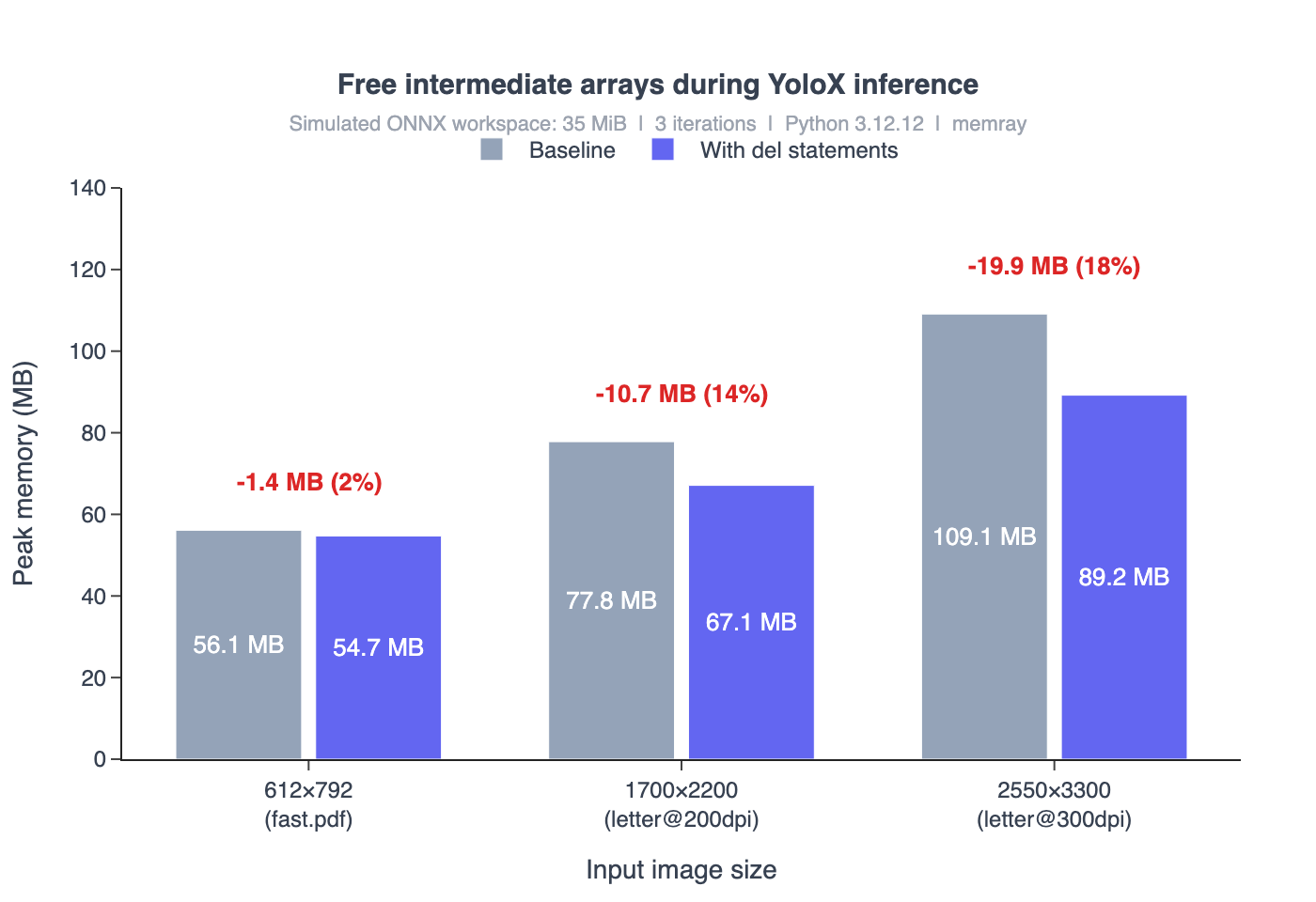 memray run+memray stats --json), 3 iterations per approach, on Apple M3 Max / Python 3.12. ONNX inference workspace simulated as a 35 MiB allocation.At the default 200 DPI render resolution (1700×2200 for US Letter), this frees ~11 MiB of dead weight before ONNX inference. Zero behavior change — just earlier cleanup of arrays that are never read again.