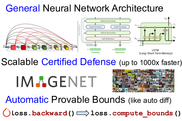 - Certified defense models for downscaled ImageNet, TinyImageNet, CIFAR-10, LSTM/Transformer. (08/20/2020)