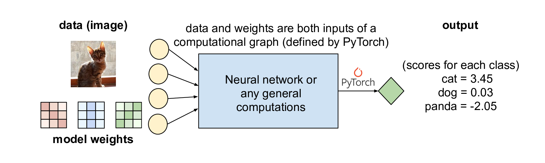 Normally, the inputs of a computation graph (which defines a NN) are data and model weights, and PyTorch goes through the graph and produces model prediction (a bunch of numbers):