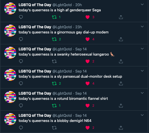 Share goofiness in regards to LGBTQ labels, then have a follow up tweet to define the label. Also have a "this day in queer history" set of tweets
