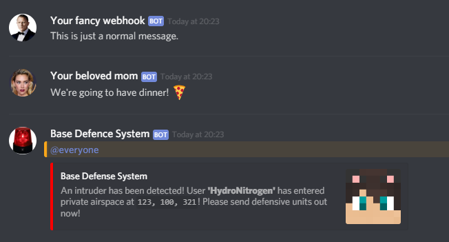 hook.sendEmbed("@everyone", "Base Defense System", "An intruder has been detected! User **'HydroNitrogen'** has entered private airspace at `123, 100, 321`! Please send defensive units out now!", nil, 0xFF0000, nil, "https://media.energetic.pw/pm5s32-c9z.png", "Base Defence System", "https://media.energetic.pw/pm5sfo-82l.jpg")
