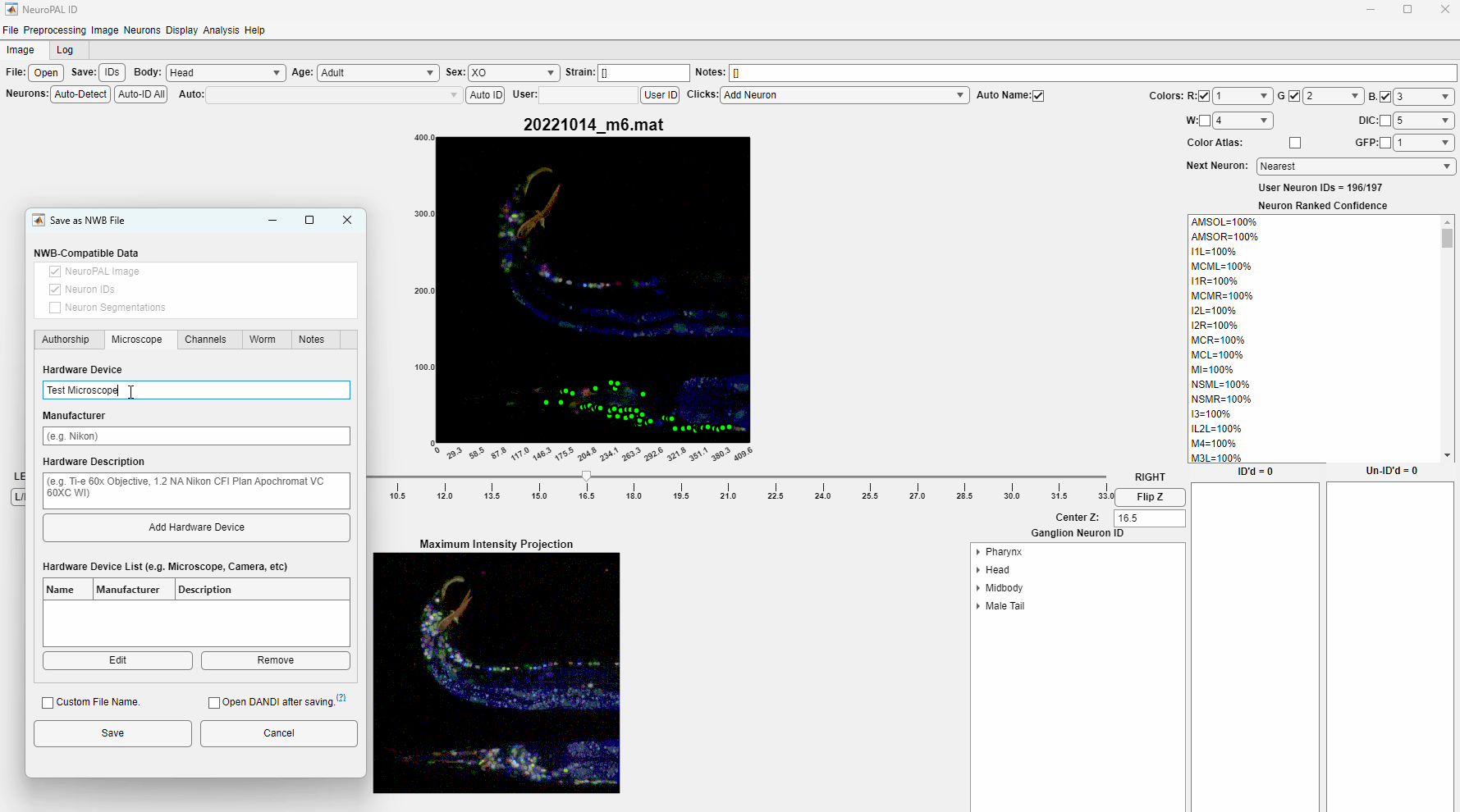 NeuroPAL_ID natively supports loading, viewing, editing, and saving data in the NWB format using the ndx-multichannel-volume extension. Future software expansions will build on this support as well.