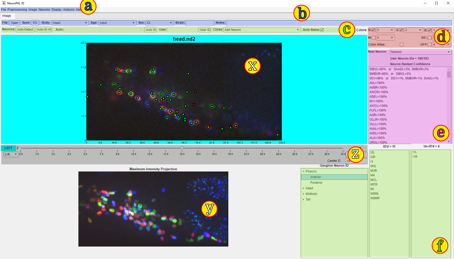 | a | This is NeuroPAL's main menu. From left to right, it contains the File menu, the pre-processing menu (where you can downsample or adjust the threshold), the Image menu (where you can manipulate the image and adjust its gamma or histogram), the Neurons menu (where you can import neurons and perform batch actions), the Display menu (where you can adjust what information NeuroPAL displays), the Analysis menu (where you can save your work), and a Help menu with convenient links. |