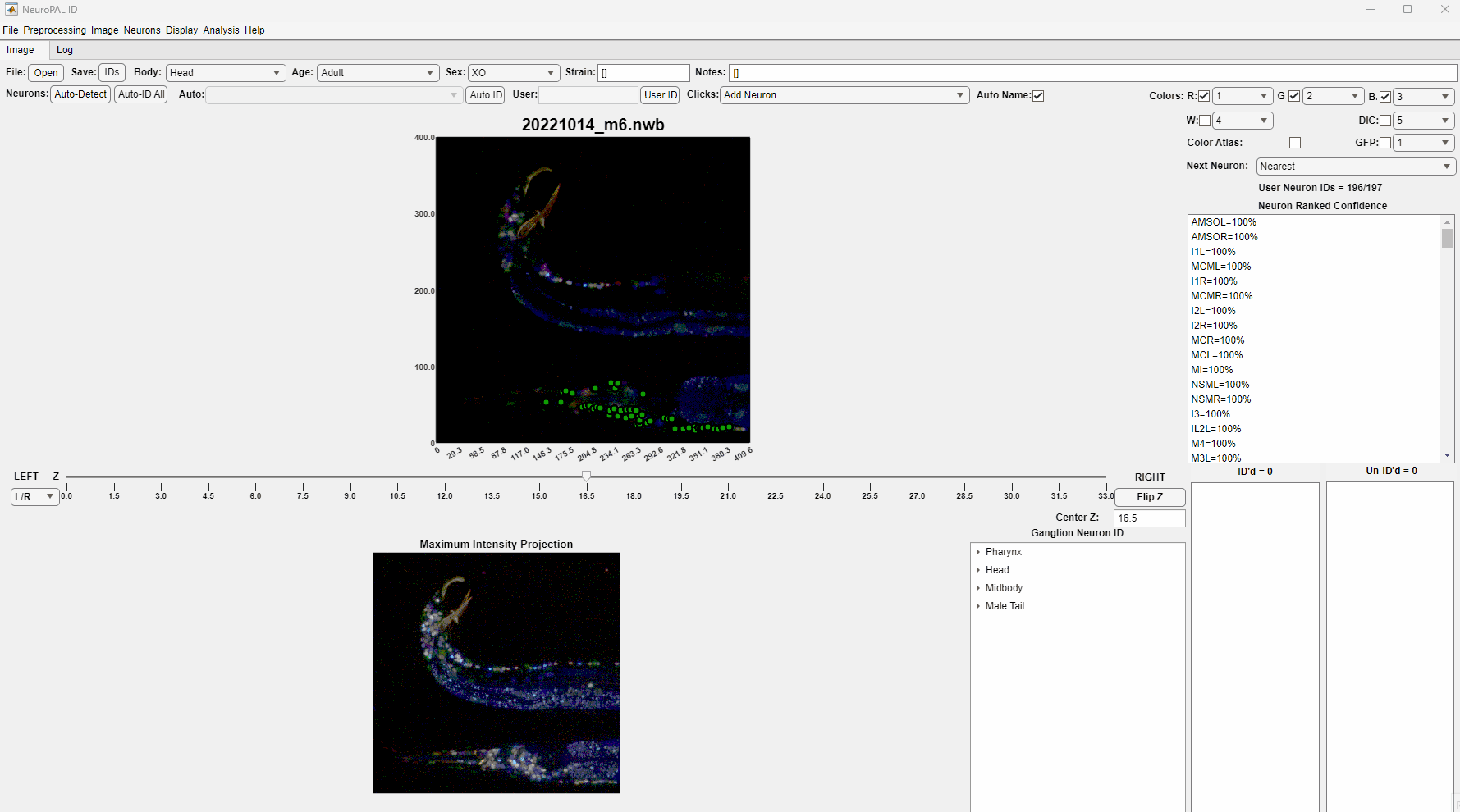 | a | This panel features 3 sub-menus: "Neuron", which displays information on neurons post-segmentation (unpopulated by default) and allows users to either export neuron centers or pass them back into the main NeuroPAL_ID window, "Image", which allows you to select a specific range of slices to segment or to switch back to the maximum projection, and "Credit", which features information regarding the origins of the particular segmentation module being used. |