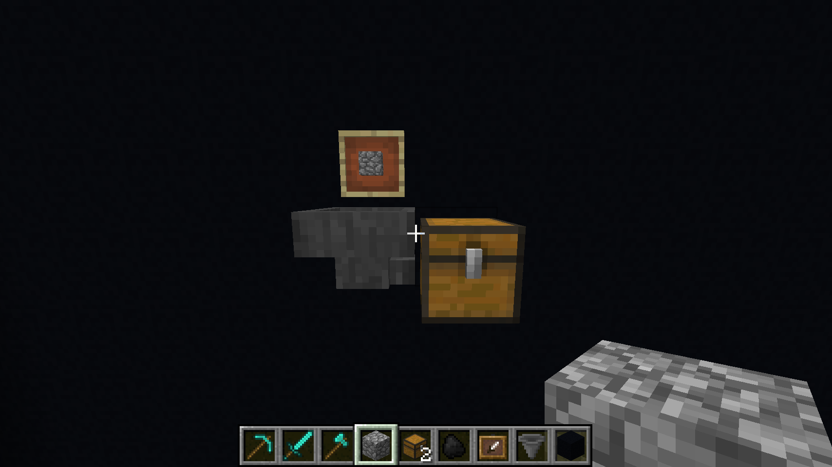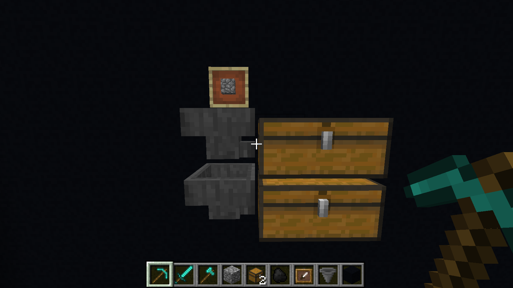 In this example, the item frame contains a block of cobblestone, which is the item representing the Stone group, so all stone items will be routed here. They'll teleport to the item frame, drop into hopper and be delivered to the chest.