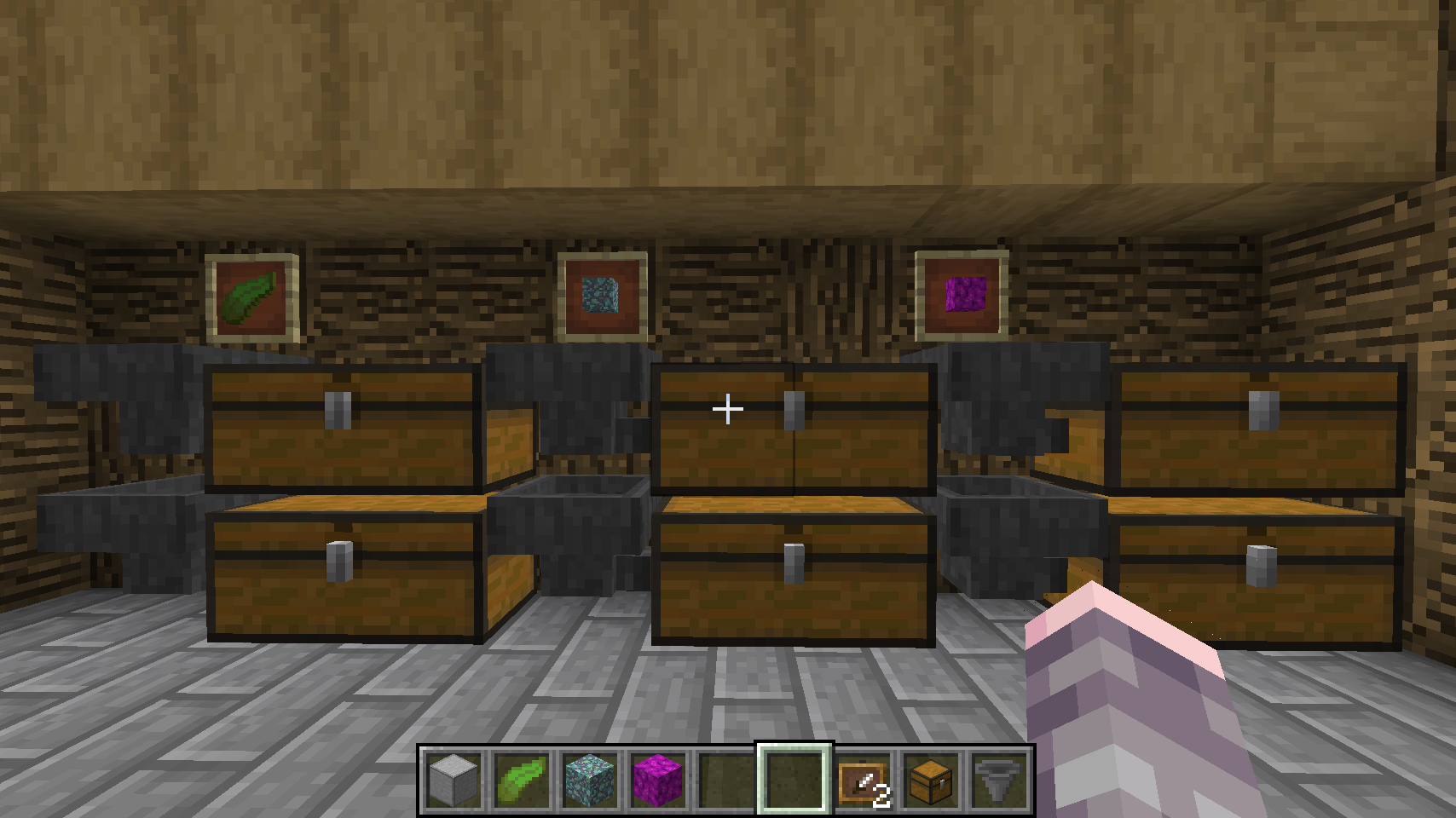 This spread arrangement has a much better chance of load balancing between multiple item frame targets, because the game treats the items as multiple smaller stacks when the chest is broken.