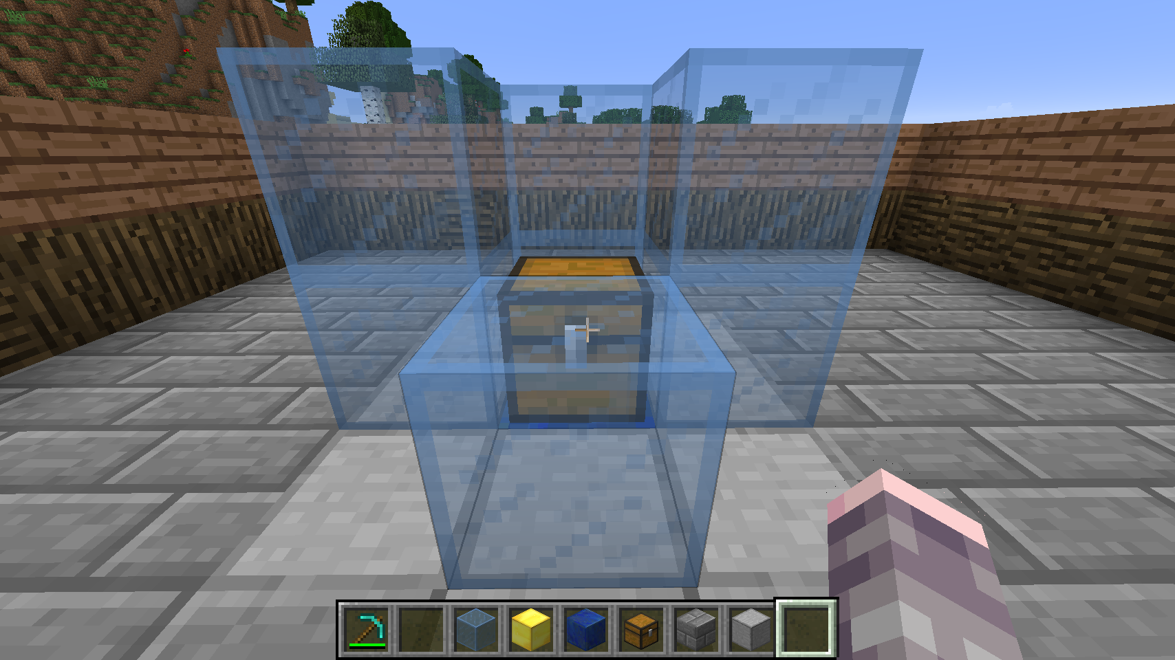 But wait, before you move on to creating storage groups and item receivers, it is highly recommended that you build some walls around your chest, because you have to break it to activate the sorting mechanism, and this tends to send the items flying about. Some simple walls can prevent that issue: