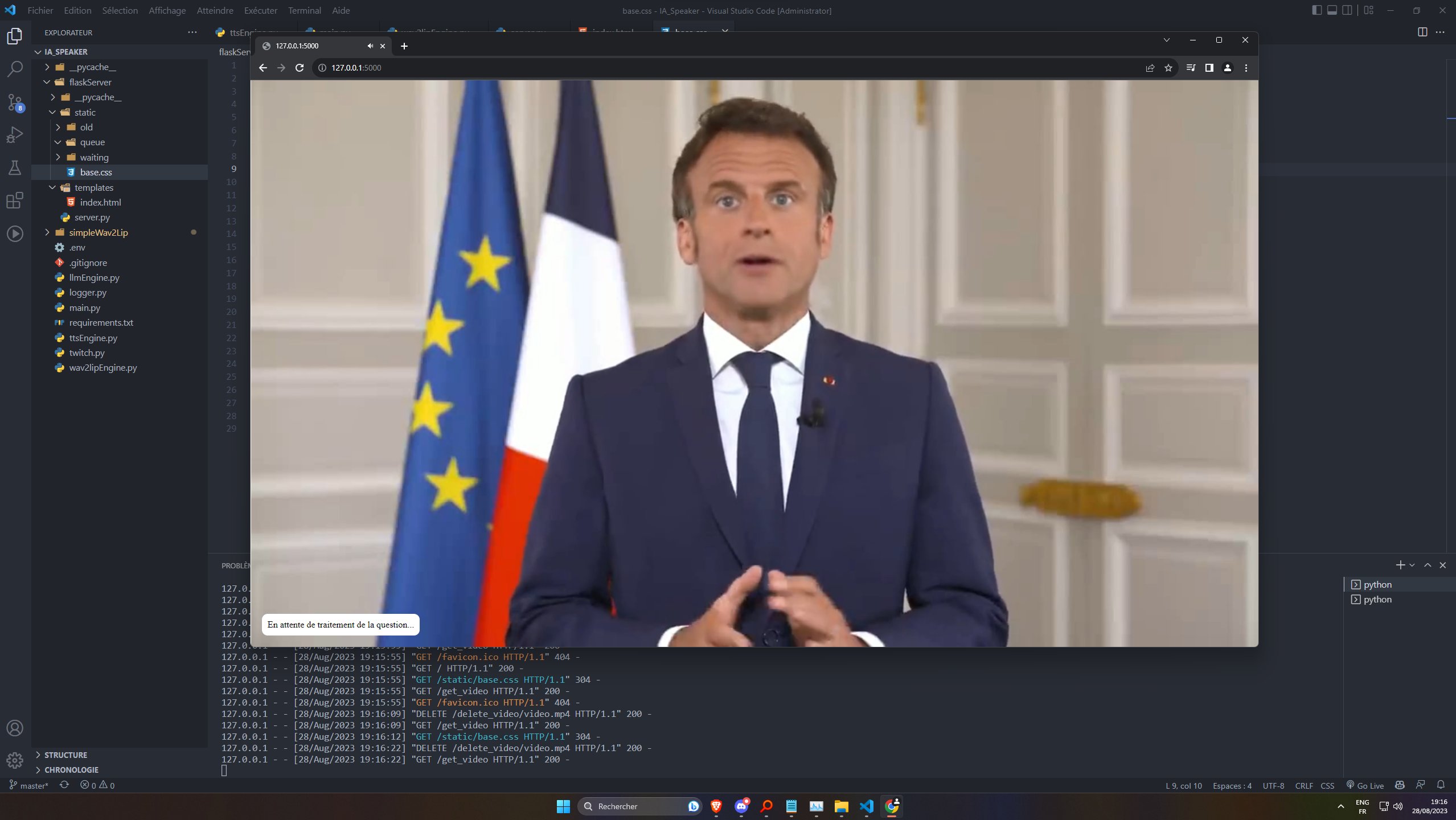 N'oubliez pas, d'ajouter vos vidéos en format mp4 de quelque chose pour combler le stream pendant la génération de la vidéo, mettez la dans IA_Speaker\flaskServer\static\waiting.
