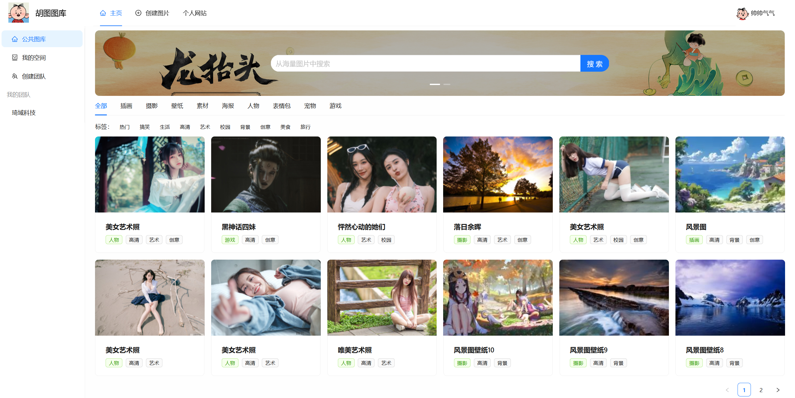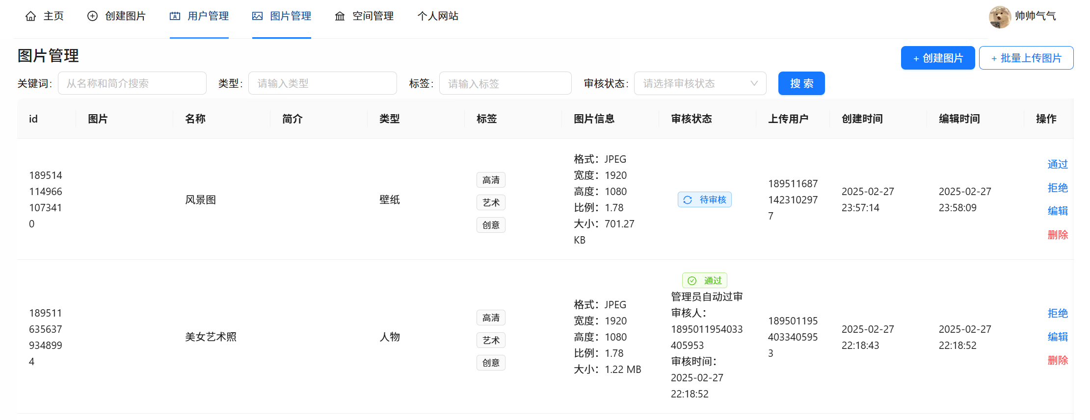 管理员可在后台进行用户管理、图片管理、空间管理等。其中普通用户上传到公共图库中的图片需要管理员审核后才能展示。