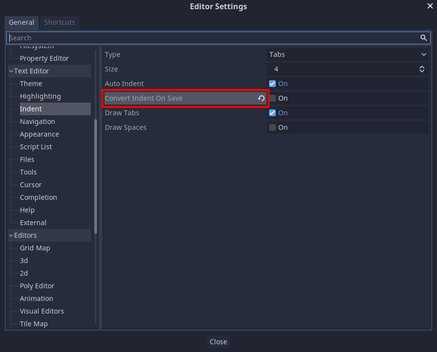 Since the error is caused by Godot automatically adding tabs into space-delimited files I'd be inclined to go the other way and enforce tabs, but I've also seen Main.gd (for example) using two spaces for indentation instead of four, so it'd be ambiguous what should count as a full indent or not. There's definitely not a technically correct solution here, it's just whatever makes it easiest to onboard people. |