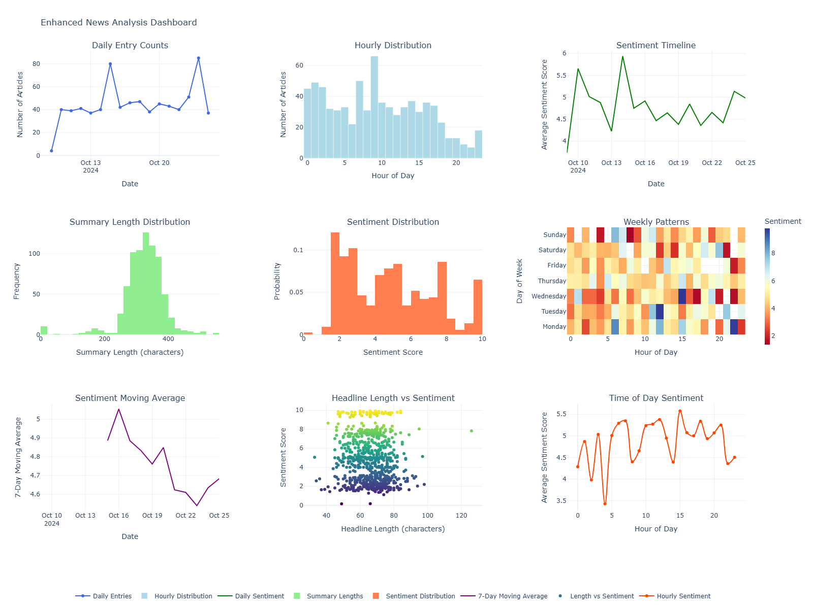 A comprehensive Python application that performs real-time sentiment analysis on news headlines, storing the results in a SQLite database and generating interactive visualizations. The system employs multiple sentiment analysis models, including VADER, FinBERT, and RoBERTa, to provide nuanced sentiment scoring.