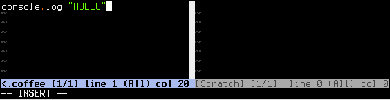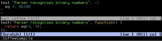 Writing some code and then exiting insert mode automatically updates the compiled JavaScript buffer.