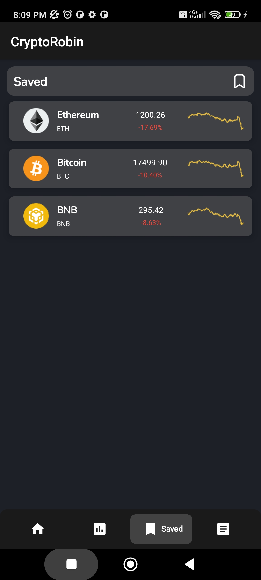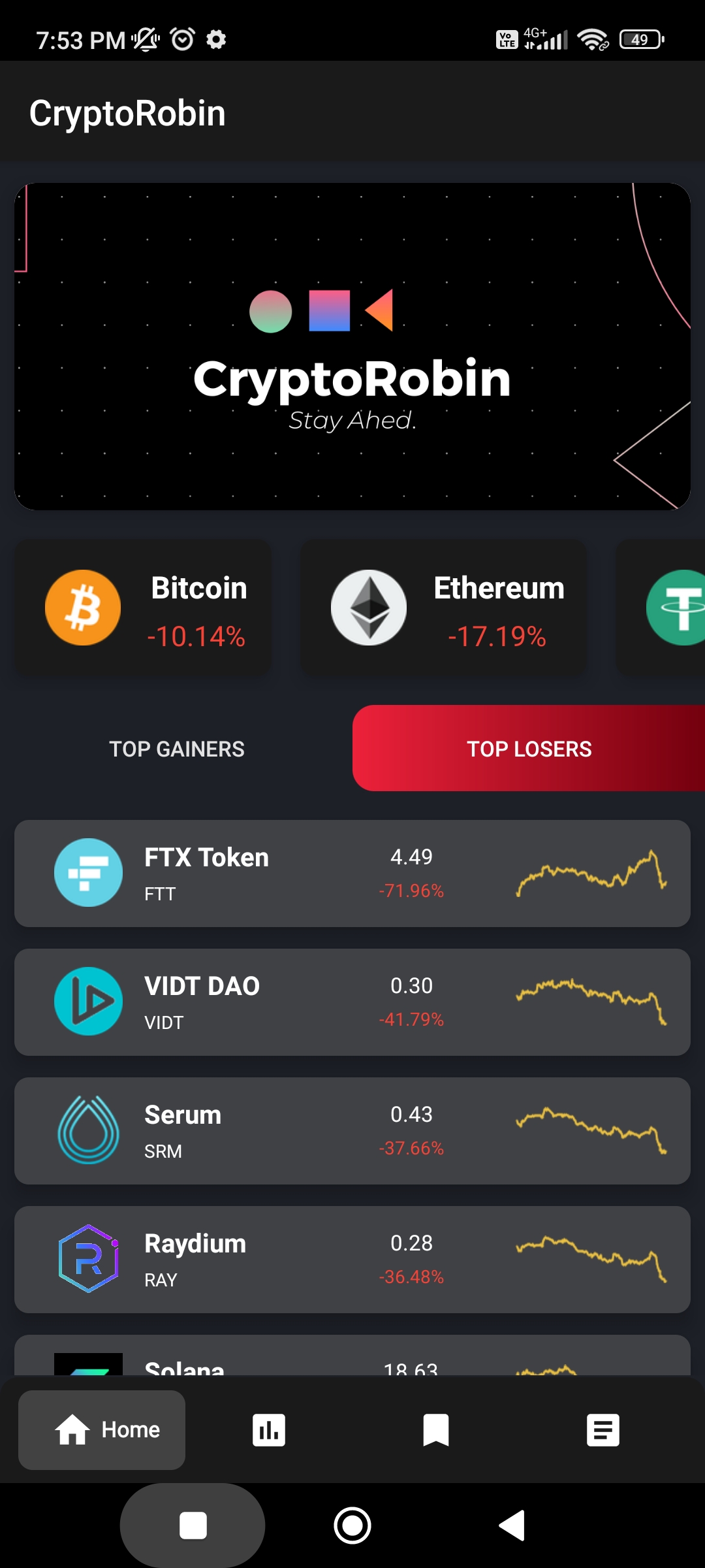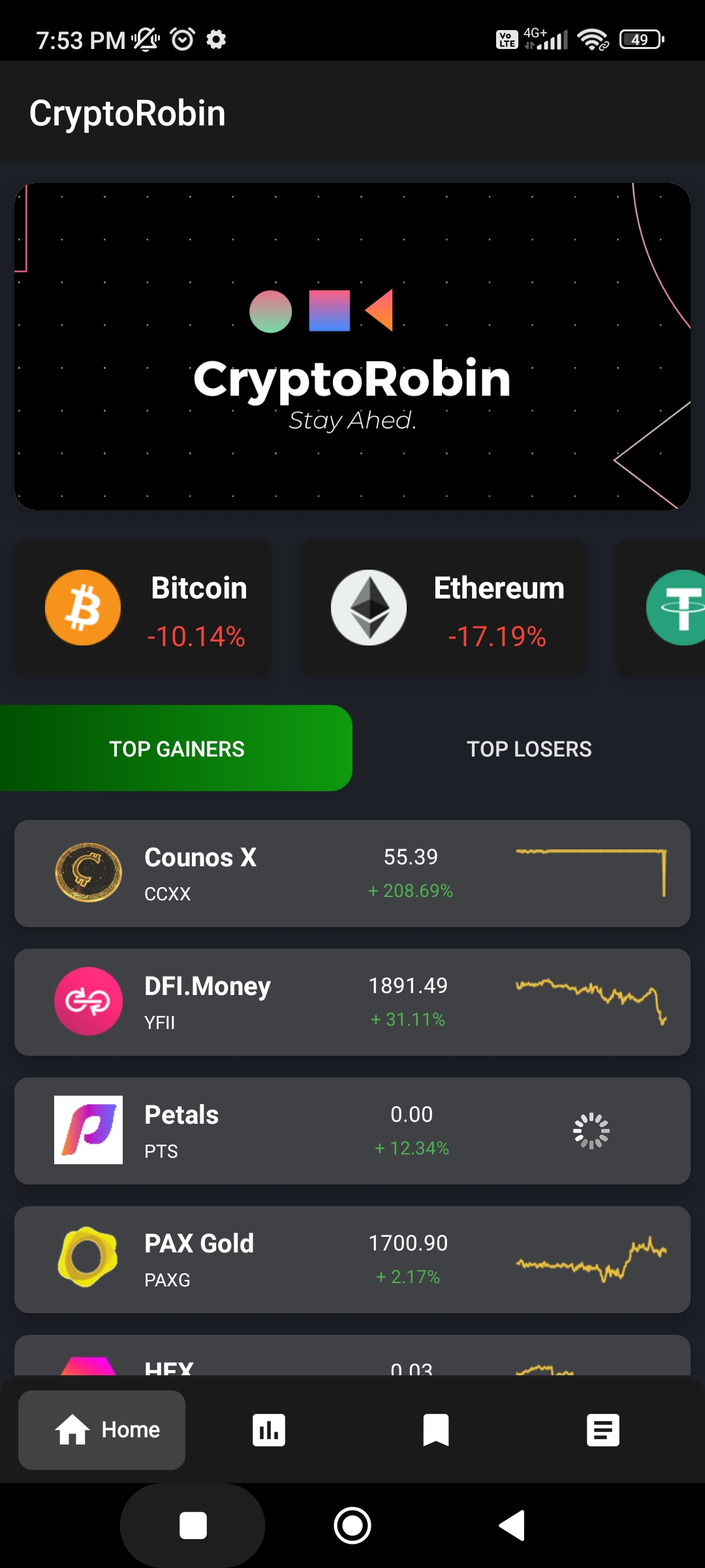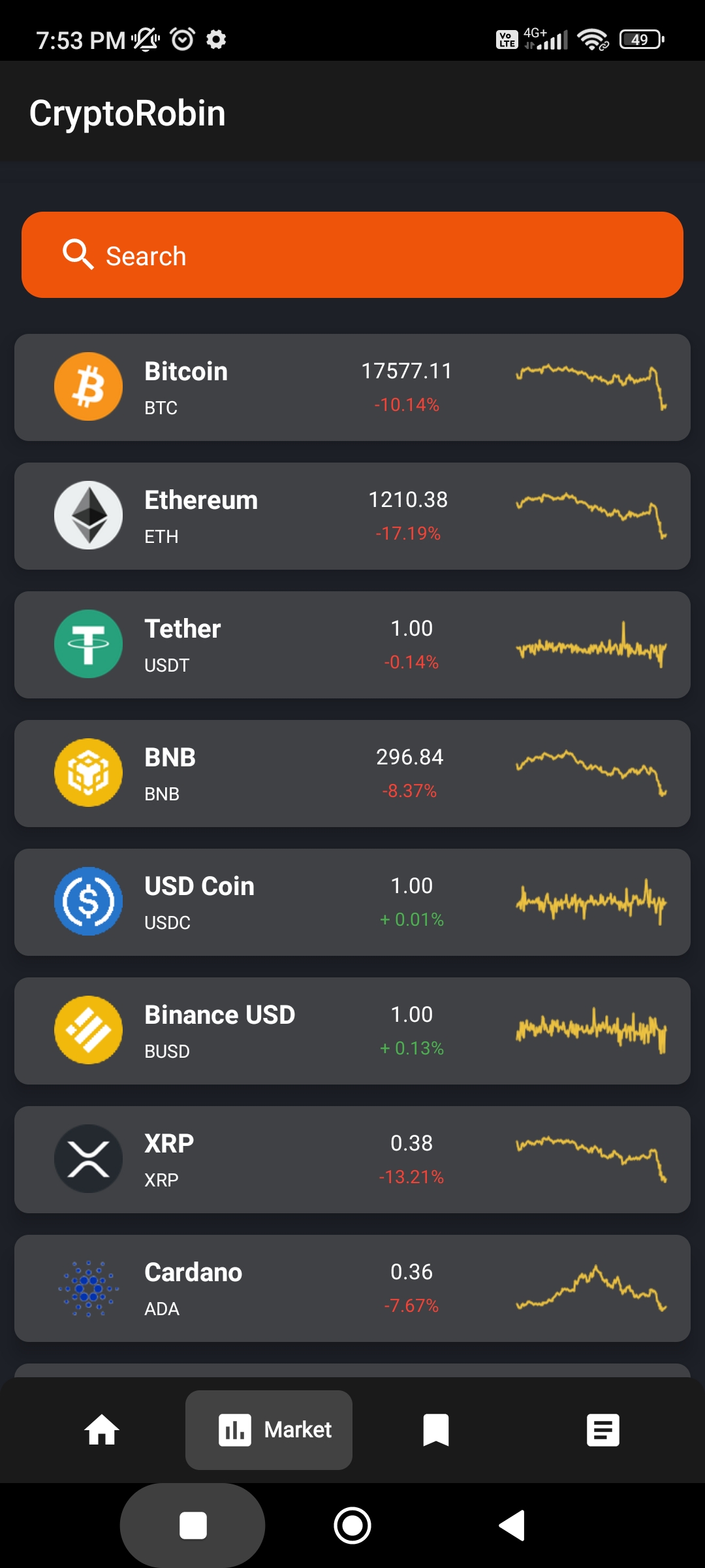 CryptoRobin is an android based mobile application which provides you with latest Cryptocurrency data like prices, top gainers/losers (24 hrs), charts and news.