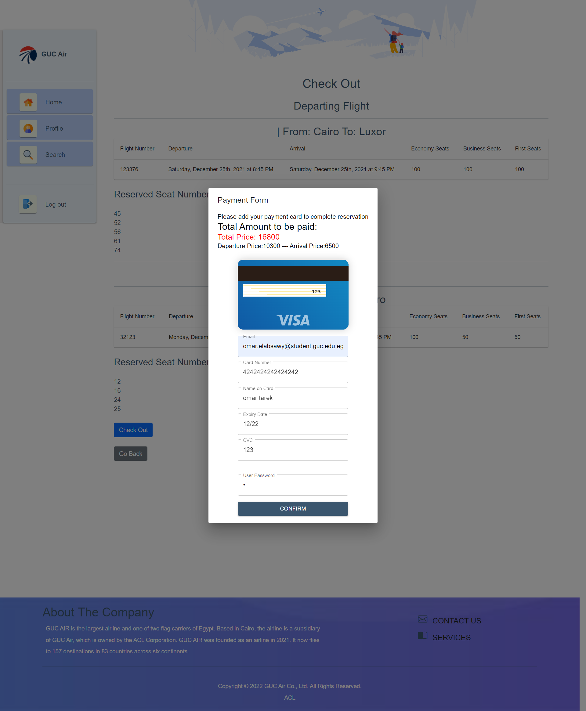 - View itinerary (a summary of the chosen departure and return flights, including the dates and times of the departure and return flights, the chosen cabin (Economy/ Business Class), the chosen seat and the total price paid for the entire ticket along with a confirmation/ booking number).
