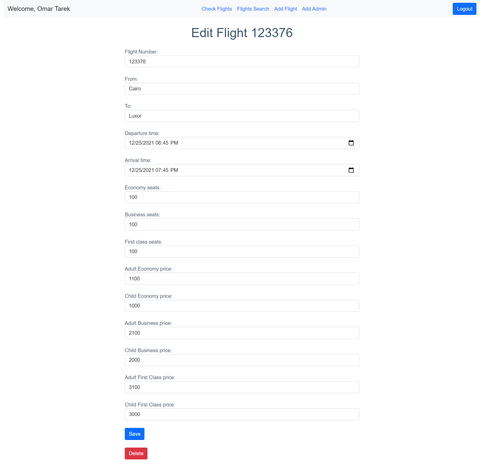 - Update any selected flight and its details including flight number, departure and arrival times, number of available Economy seats, number of Business Class seats, dates and airports.