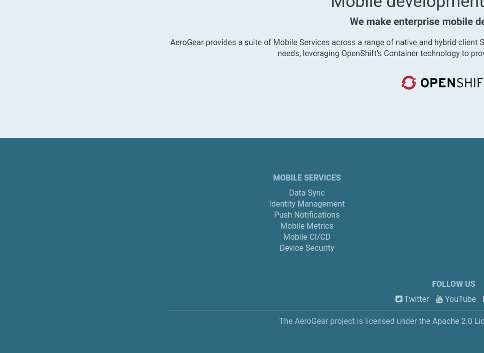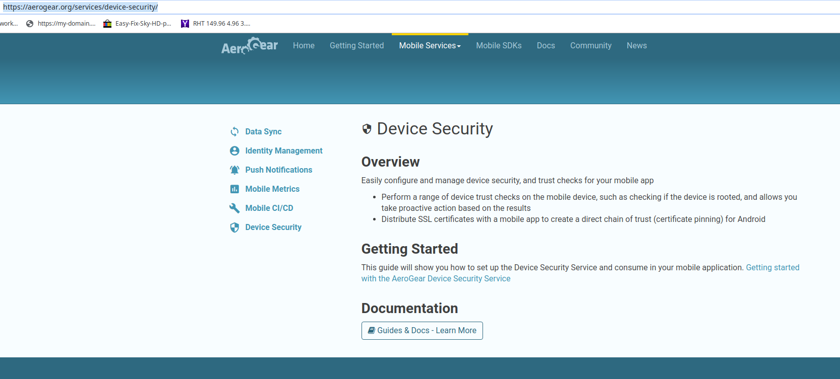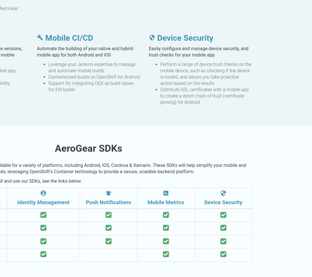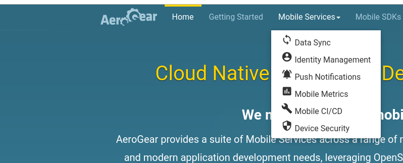 The drop down menu and footer on and the aerogear.org home page refer to device security with no reference to mobile security service.