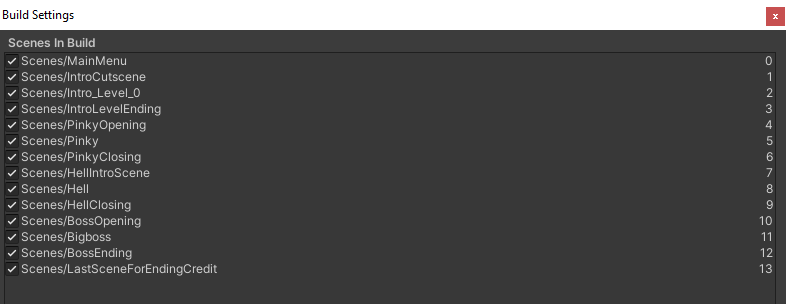 - Ensure that the Scenes in Build match this order. Scenes can be dragged and dropped with the mouse to adjust order