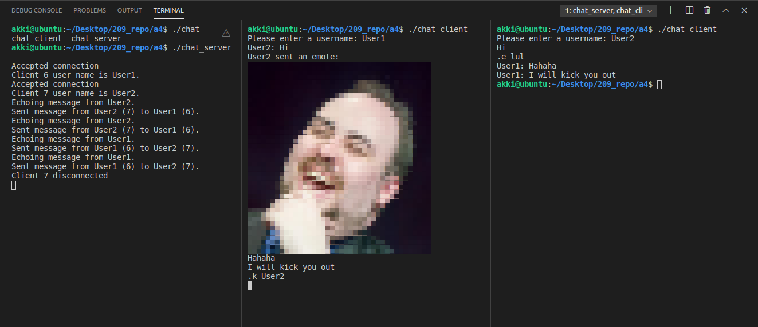 In order to kick a user, one needs to send the message in the following format: .k username. Only admin has the privilege to kick any user. Admin is the first ever client connected to the server. In case, the admin decides to kick itself, then the user who joined after admi, becomes the new admin. Any kick command from a non-admin user will simply be ignored.