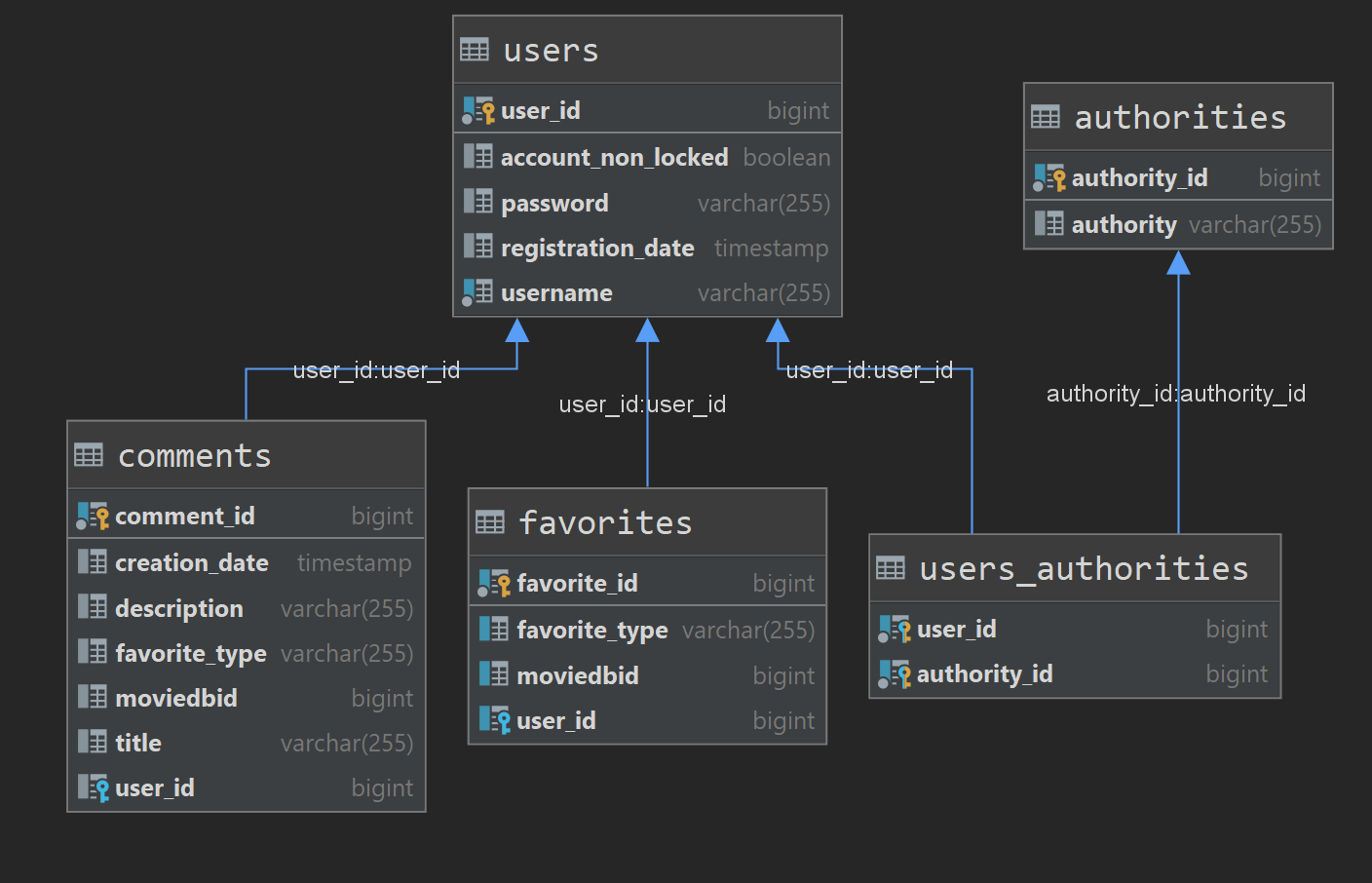 GraphQL API for my Movie DB React App Playground (click) On the right side you will find 2 buttons Docs and Schema. Click on the on the Docs and try a few queries GraphiQL (click) Same as the above. In the top right side click the Docs button and go from there Voyager (click) Link to Voyager as well Dependencies Used Spring Security JJWT JWT generator Graphql Java Kickstart Playground Graphiql Voyager Spring Web Spring Data JPA Hibernate Validator PostgreSQL as a DB Spring Actuator ModelMapper Spring Devtools Lombok Schema (PostgreSQL)