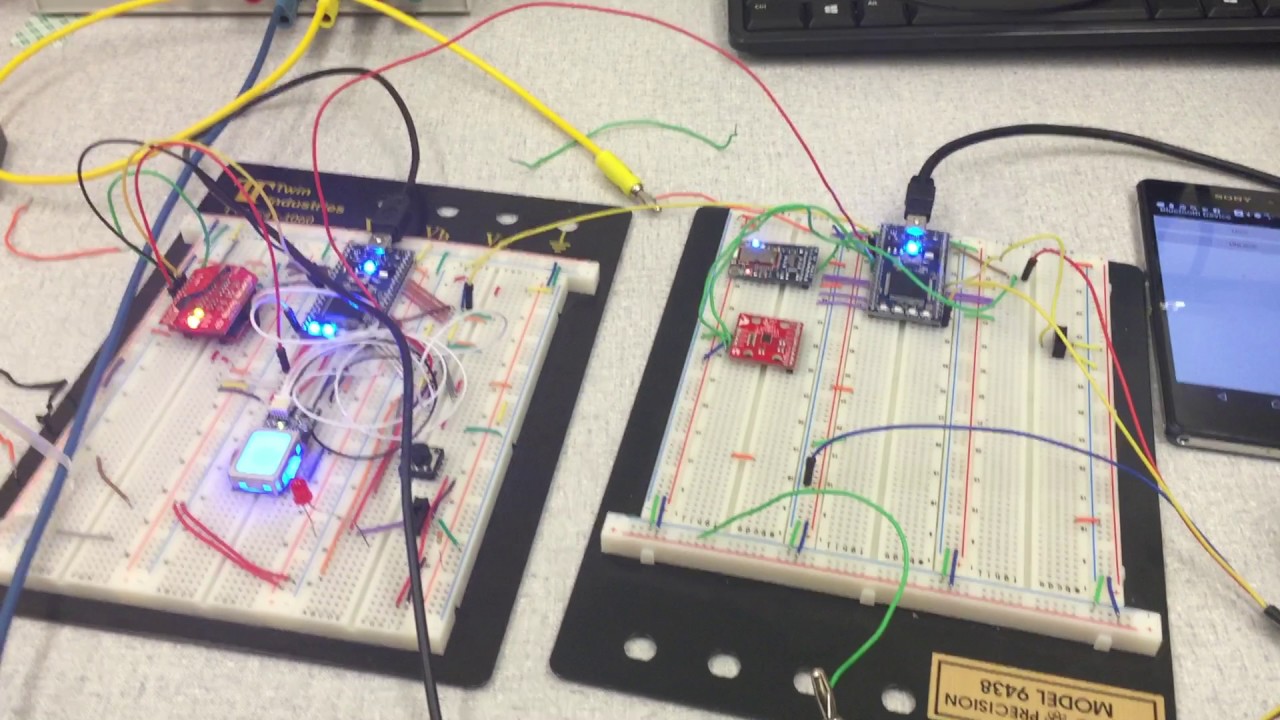 Each mBed LPC1768 has 3 UART serial communication channels, while this project requires a serial communication channel for each of the four necessary peripherals. In order to overcome this, we employ two mBed modules and have them communicate via DigitalOut/DigitalIn mBed APIs.