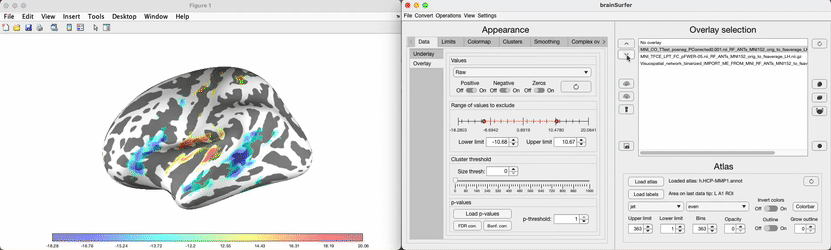 It serves to quickly create pretty figures from data you have already processed and analyzed elsewhere. It supports projecting data from volume space onto freesurfer's fsaverage and connectome workbench's fs_LR (s900) spaces. It's also compatible with a wide range of file types that store surface data (cifti, nifti, gifti, and freesurfer's label, annotation and morphology formats lilke .curv), and can be easily used to convert files between these formats. BrainSurfer can also perform lots of operations on surface maps (e.g., thresholding based on ranges of values, cluster sizes, and p-values, but also outlining clusters, smoothing, combining, masking, and averaging maps, and lots of other stuff) and can take automated standardized screenshots of large numbers of surface maps. Its visualization capabilities include the ability to modulate the transparency of surface maps by other maps, and to represent two to three surface maps on one mesh using 2-D (square) and 3-D (cube) colormaps. It contains a GUI for creating your own colormaps and supports saving GUI states so that you can share surface data visualizations with other users exactly as you've set them up in BrainSurfer, even if those users don't have the files you used to generate the visualizations.
