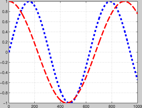 plot(sin(linspace(0, 10, 1000)), 'b:', 'LineWidth', 4);