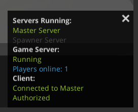 When you're in your game scene, hit "Play" in the editor. As before, it should start master and game servers automatically. You should be able to start the client you just built, and connect to the game.