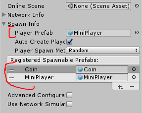 Add the MiniPlayer and Coin prefabs to the list of spawnables (you can find prefabs at