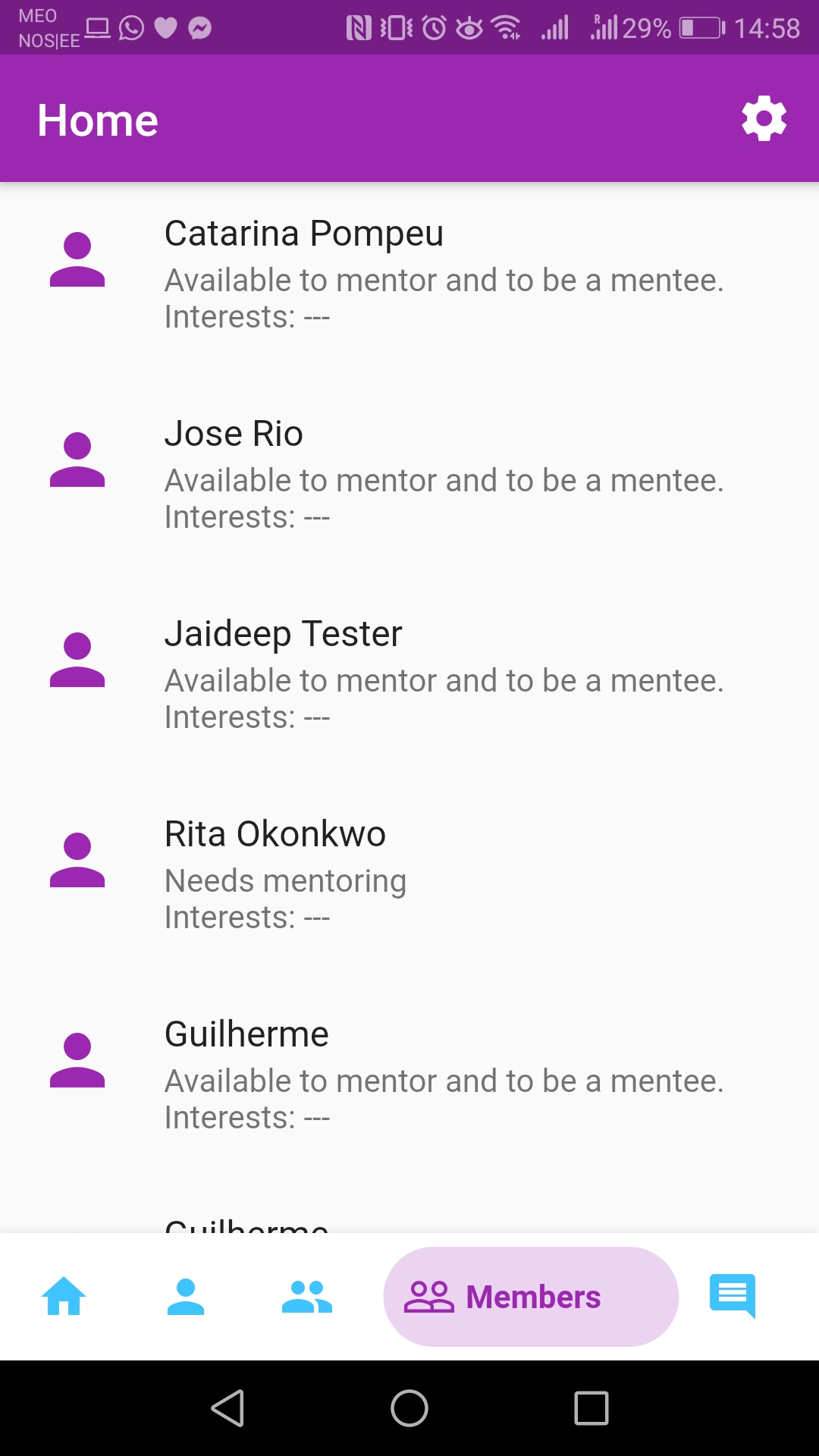 The image shows Members icon selected, because it is the current screen, but the title shows "Home":