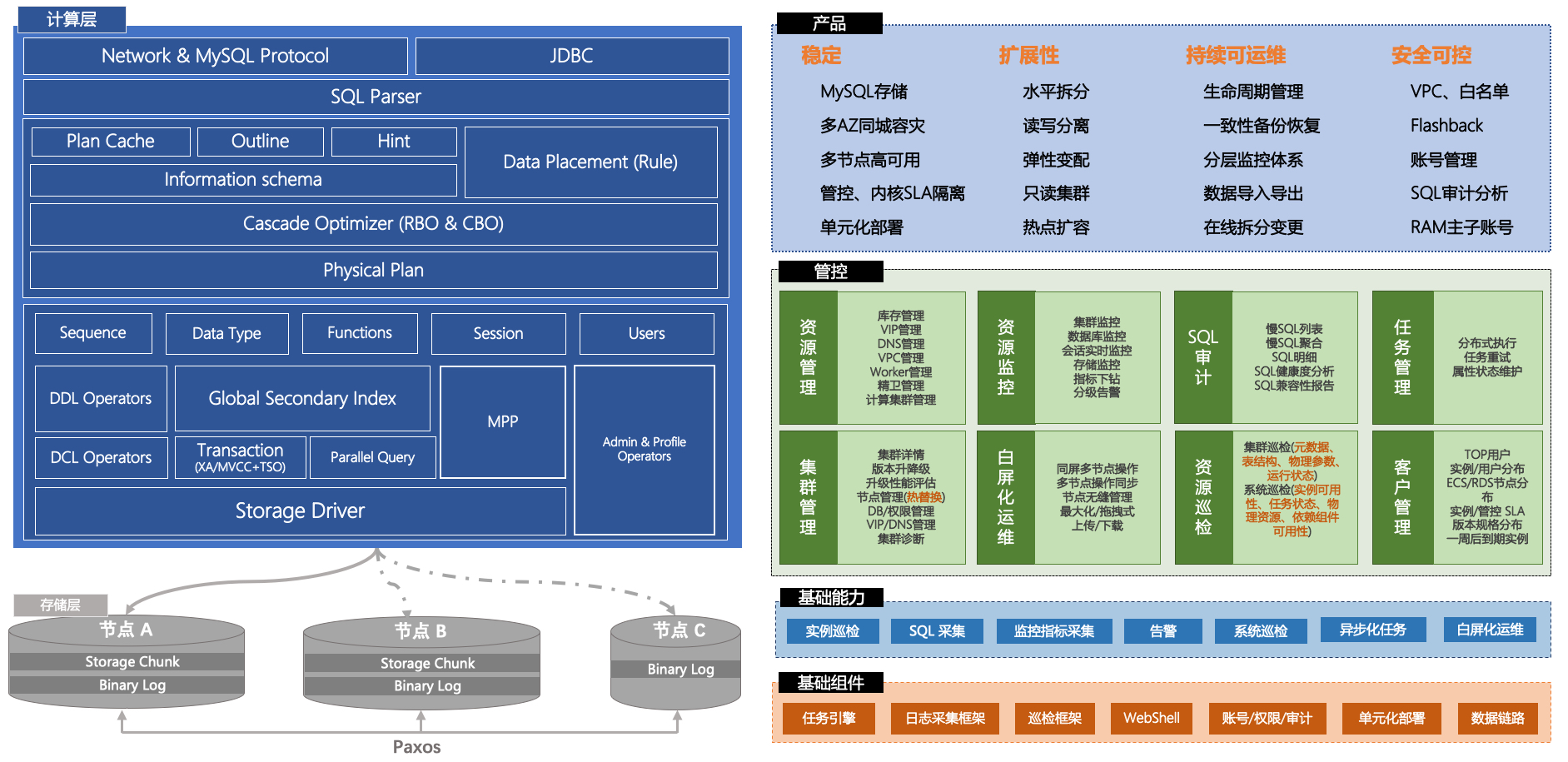 - 2019年,PolarDB-X正式被提出(key:架构与品牌升级)。由DRDS转型为PolarDB-X 1.0,其不仅继承了DRDS的所有优点,还加入了更多企业级特性,支持以PolarDB MySQL为存储节点,强化了安全性和可靠性。PolarDB-X 1.0支持以PolarDB MySQL作为存储节点,大幅提高集群IO能力以及柔性分布式事务,且面向政企客户需求增强了安全特性,例如,一致性备份恢复、SQL闪回、SQL审计等。