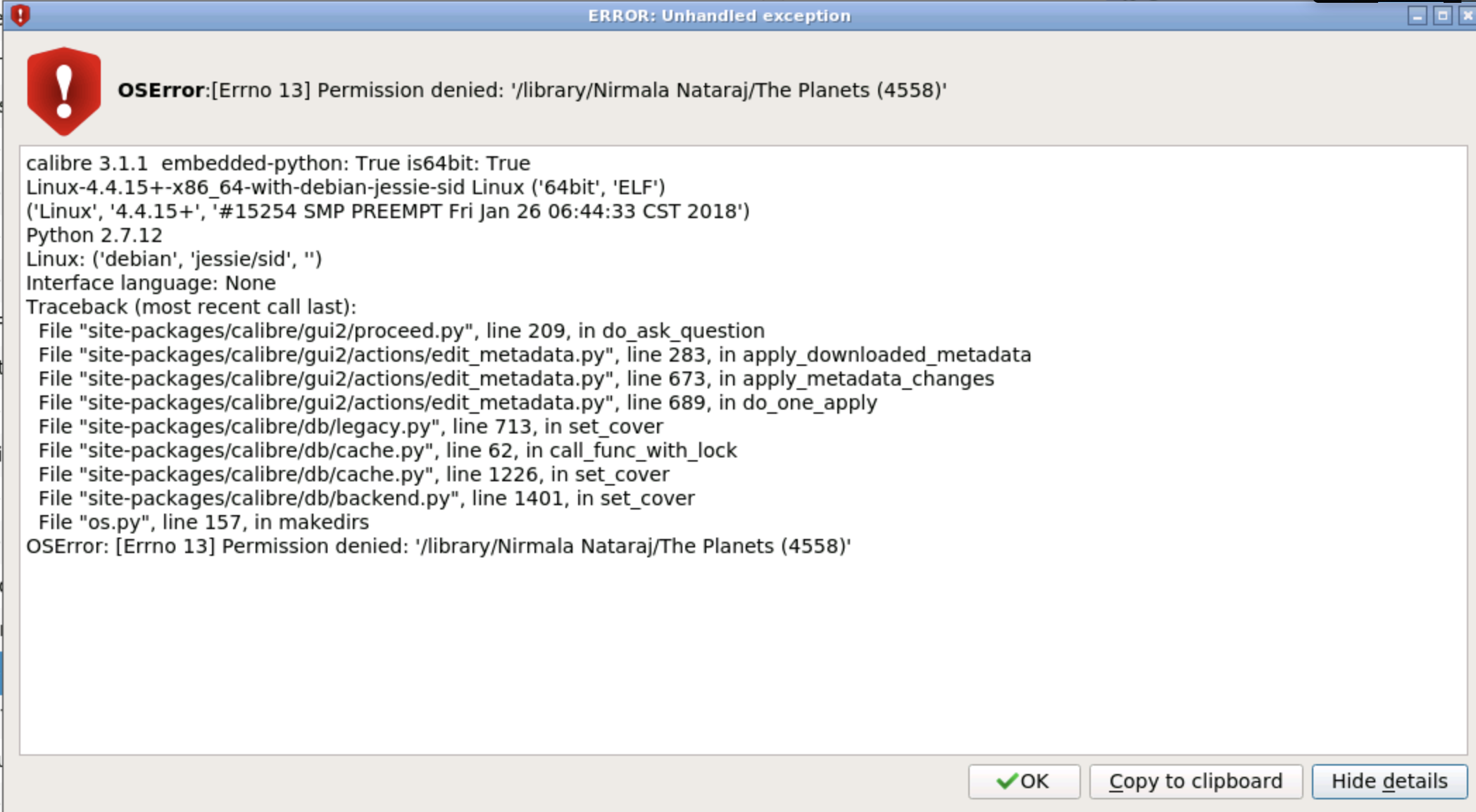 Hi there, i have a problem with downloading metadata for the books. Infromation is succesfully downloaded from the internet, but when hitting apply button, i get the following error: