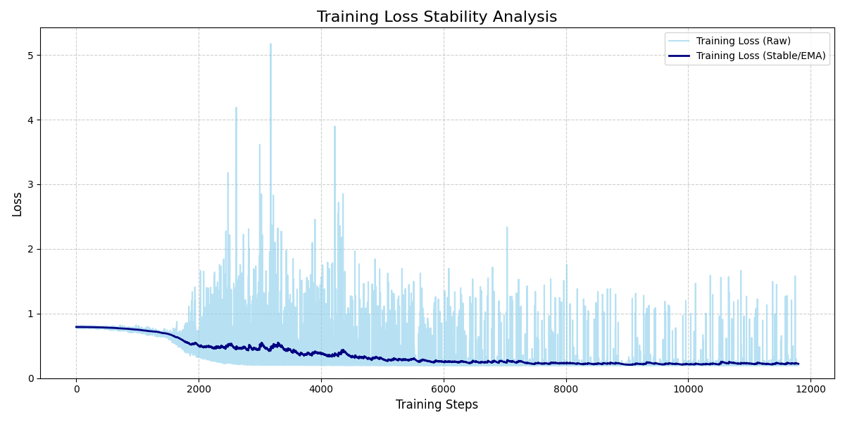 Intelligent Early Stopping: The training process is not just powerful but also efficient. In this example, the process was scheduled for 18,109 steps but was intelligently halted at 11,799 steps by the early stopping mechanism. This feature saved significant time and computational resources by automatically detecting the point of maximum learning, preventing hours of unnecessary training.
