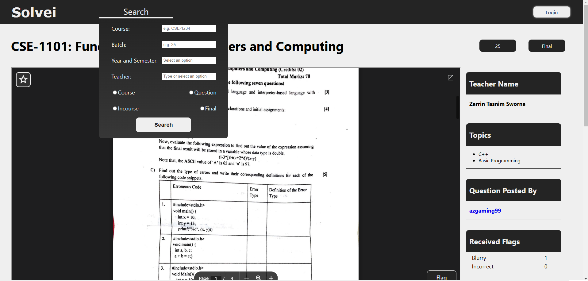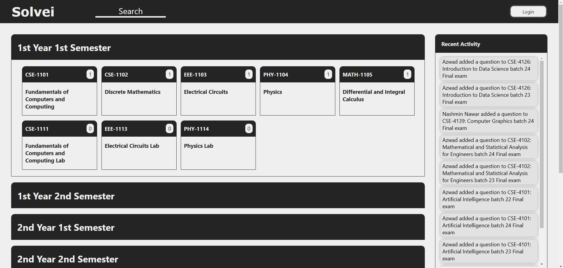 Solvei is a platform dedicated to helping CSEDU students by providing a searchable archive of past exam questions. Users can search for questions by year, course code, or instructor, making it easier to find relevant materials for their studies. Additionally, students can contribute by posting answers or leaving comments on specific questions. The backend is hosted on Render, while the frontend is deployed on Vercel. The project was developed using React.js for the frontend, Express.js for the backend, and JavaScript as the primary programming language. The design was implemented using basic CSS as a personal challenge.