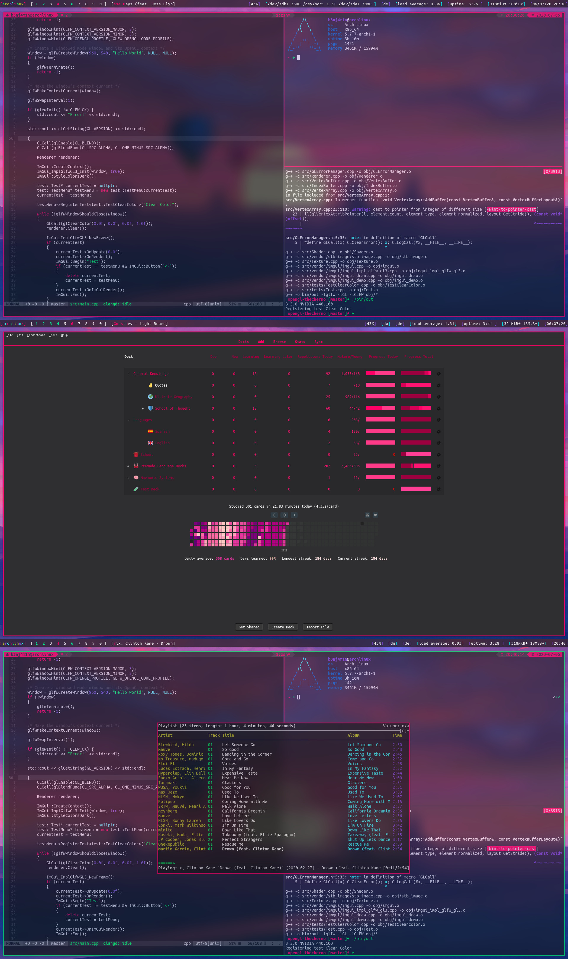Finally, I keep some documentation in docs/. Here, you'll find my arch install guide, for example, and some general notes about stuff that was unnecessarily difficult to set up.
