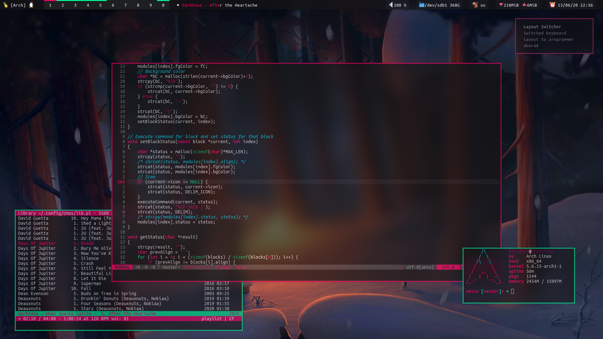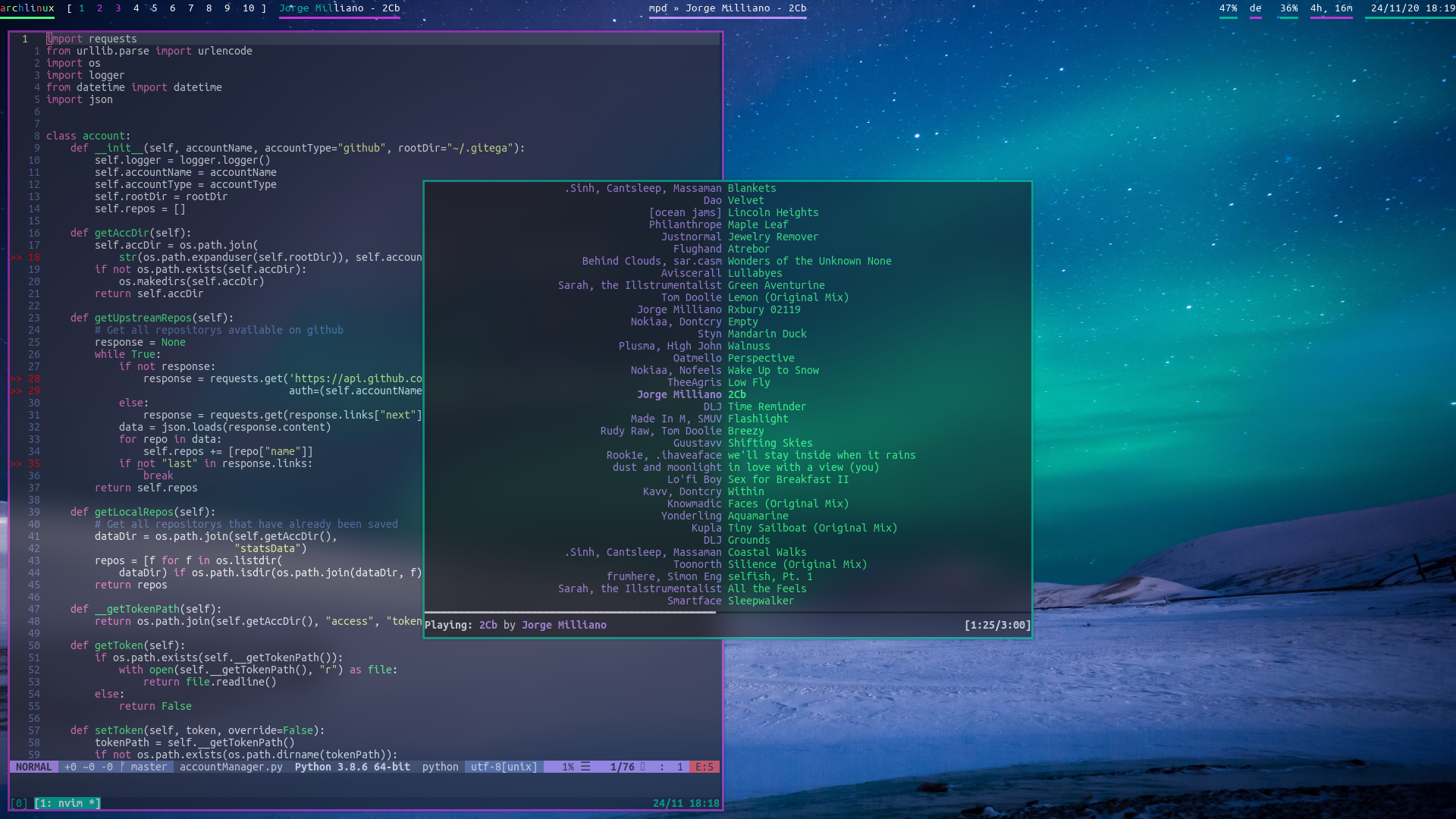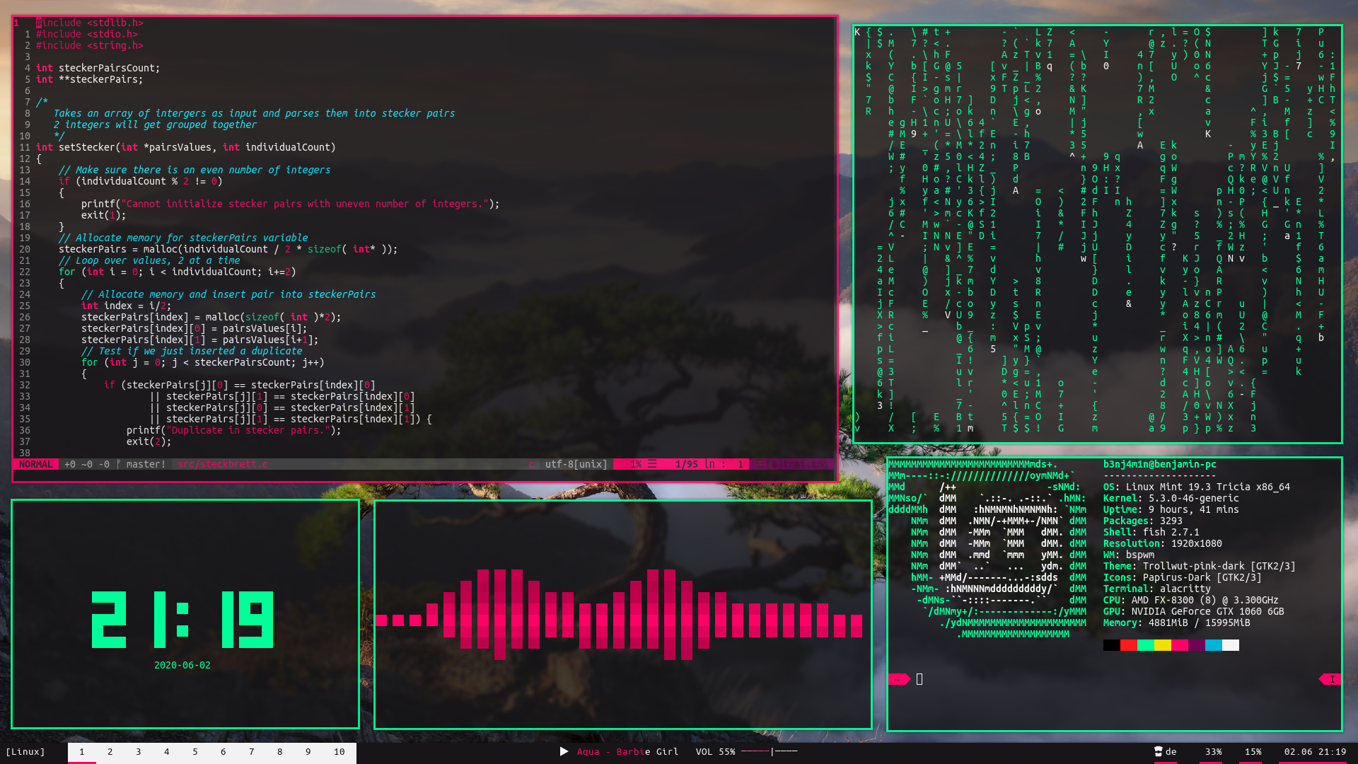 I use neovim as my texteditor. I've used emacs in the past, I liked it, but I prefer something more lightweight. I use a ton of plugins for neovim, you can find my full configuration in files/nvim/. My config is currently written in fennel. I wrote my entire config in neorg, but unfortunately, getting the required dependencies to extract all code blocks using tree-sitter is a bit of a hassle, so for now I've copied everything over to config.fnl and commented out the norg parts.