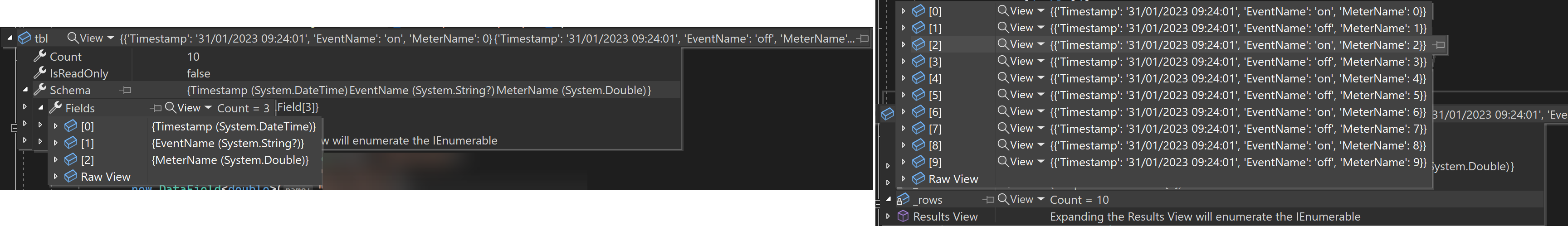 new DataField<double>("MeterName"));The code above says we are creating a new empty table with 3 fields, identical to example above with class serialisation. We are essentially declaring table's schema here. Parquet format is strongly typed and all the rows will have to have identical amount of values and their types.