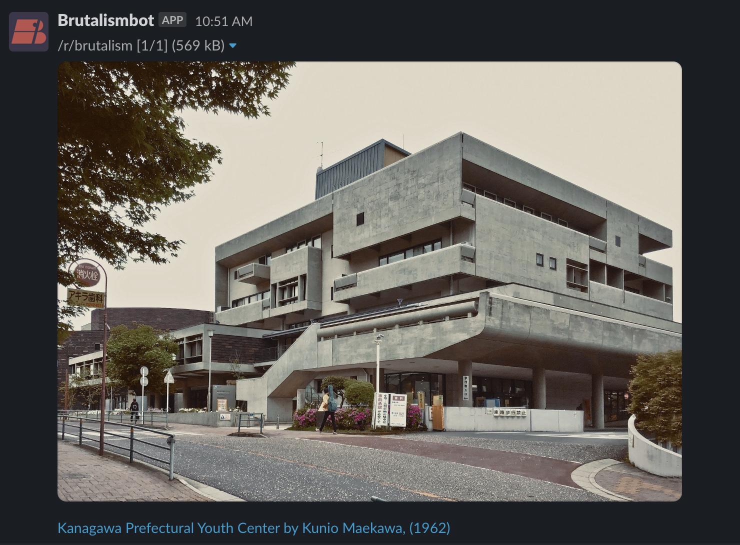Mirroring posts from /r/brutalism to Slack, Twitter, and Bluesky. Example Slack message: Example Tweet: Example Skeet: