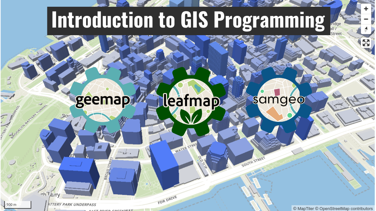 Geospatial Applications: Delve into Python’s application in the geospatial realm. Learn to create interactive web maps using Leafmap, visualize vector and raster data, and explore 3D mapping with MapLibre. You'll also get hands-on experience with a number of specialized geospatial libraries, including GeoPandas, Rasterio, Xarray, Rioxarray, Leafmap, Whitebox, MapLibre, Geemap, SAMGeo, HyperCoast, DuckDB, and more.