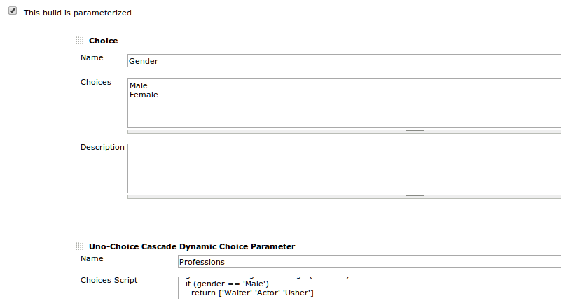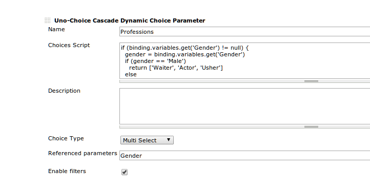 This parameter has the same features as the Uno-Choice Dynamic Choice Parameter, but with the cascading feature. This feature enables this plug-in to be re-rendered once one of its referenced parameters are changed (clicked, selected).