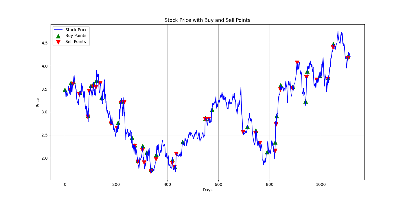 Automated stock trader bot Given a csv of stock prices this bot chooses when to buy and when to sell while outputing a chart to show when it bought and when it sold Screenshots