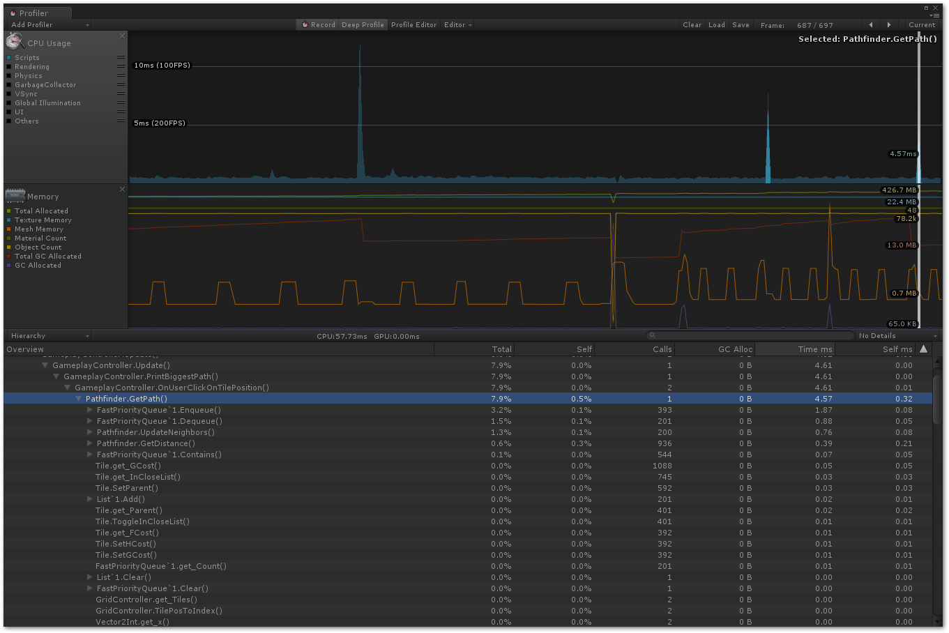 The idea was pretty simple, implement a simple A* Pathfinder and use Unity Profiler to try to optimize the best as I can, trying to reduce the GC and the MS from the method itself