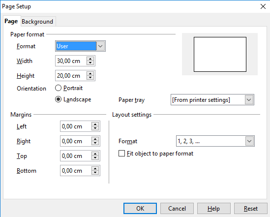 - Page Setup (Format menu -> Page)