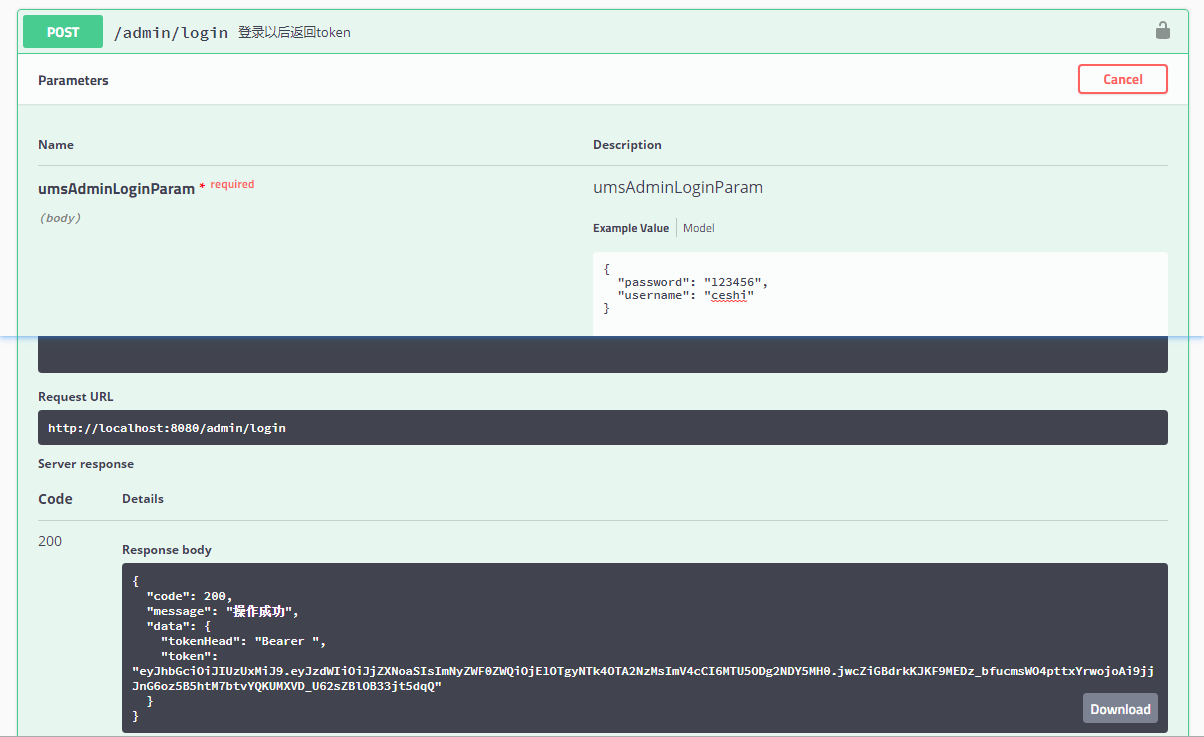 String token = adminService.login(umsAdminLoginParam.getUsername(), umsAdminLoginParam.getPassword());
