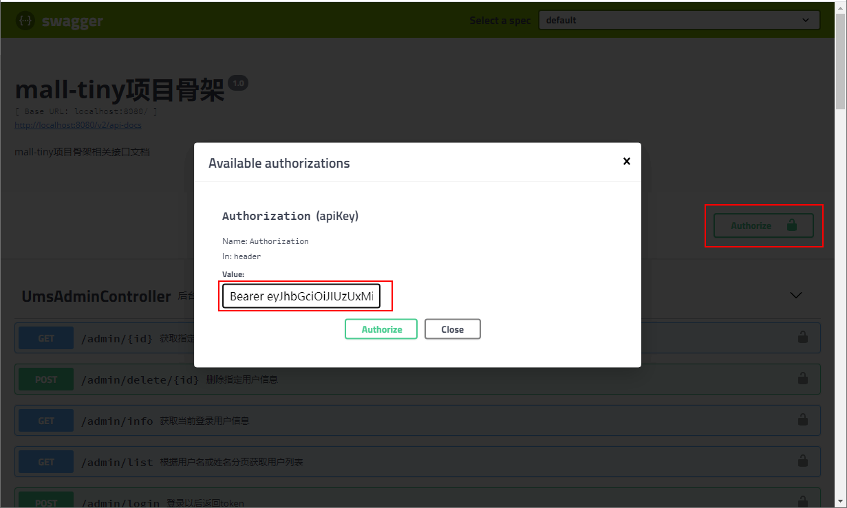 - 点击右上角Authorize按钮输入token,然后访问相关接口即可。